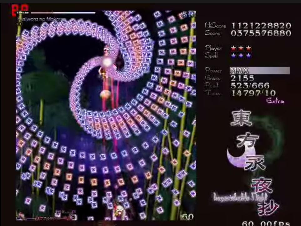 ¿Cómo funciona un jefe? Pues es fácil. Los jefes constan de varias barras de vida, y sus barras de vida a su vez están divididas en secciones. Hay unas secciones en las que el jefe nos ataca de forma normal, conocidas como “non-spells”. Una vez le quitamos toda la vida de esa sección comienza otra sección conocida como “spellcard”. La única diferencia entre un non-spells y un spellcard es que durante el spellcard el fondo cambia, que el patrón de las balas suele ser mucho más elaborado y que si completas la spellcard sin morir o usar una bomba te llevas puntos extra.